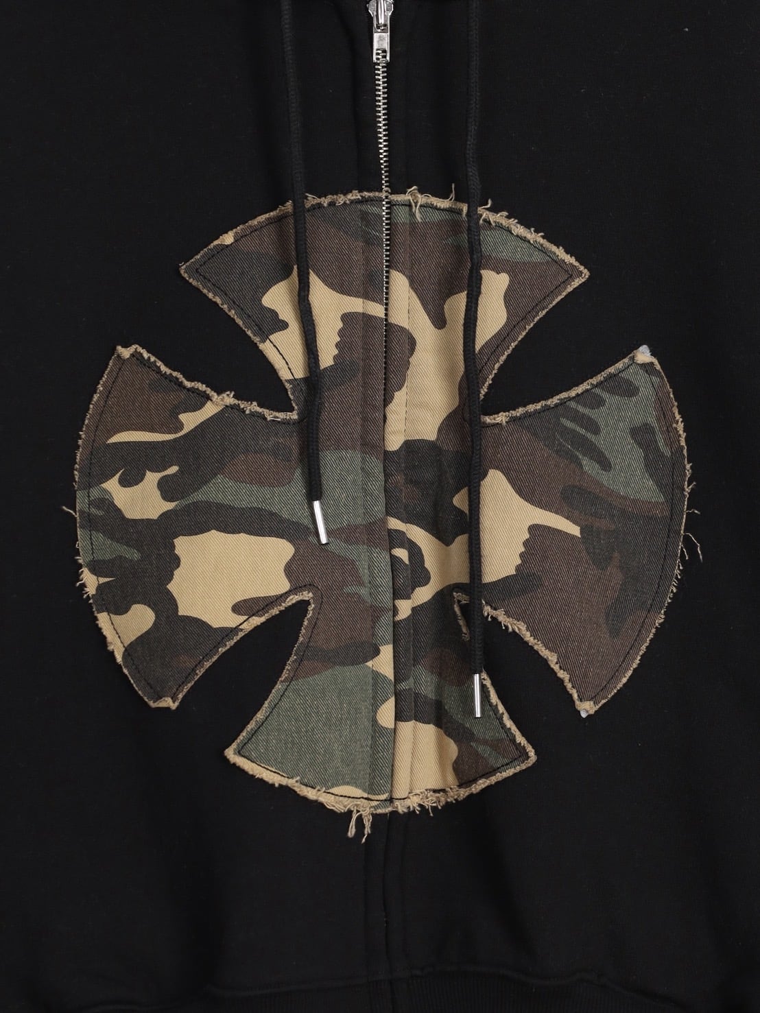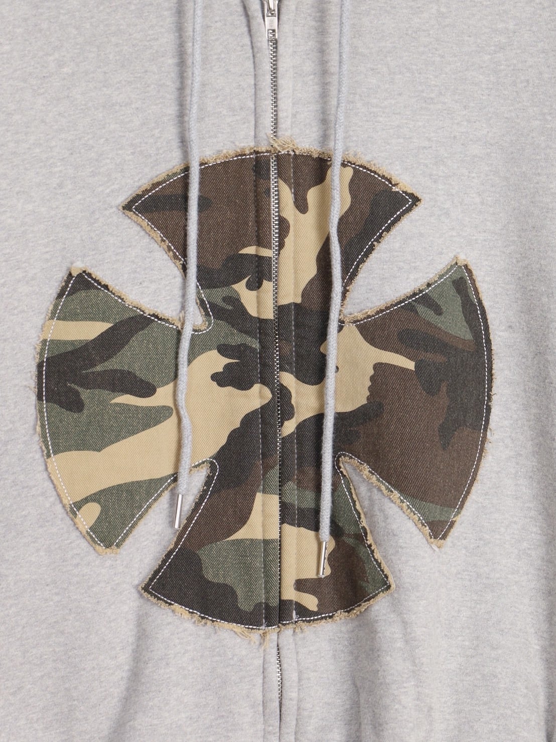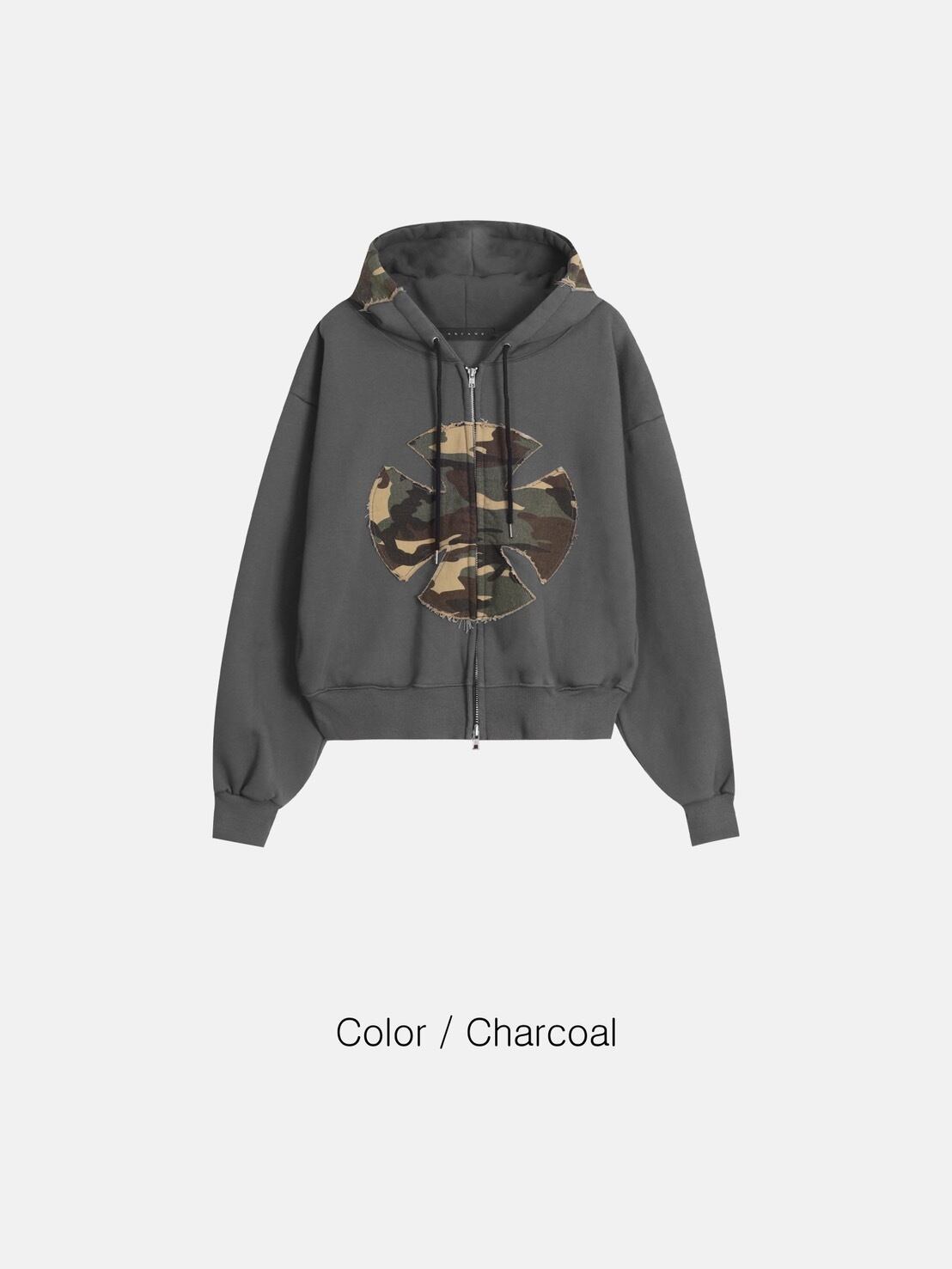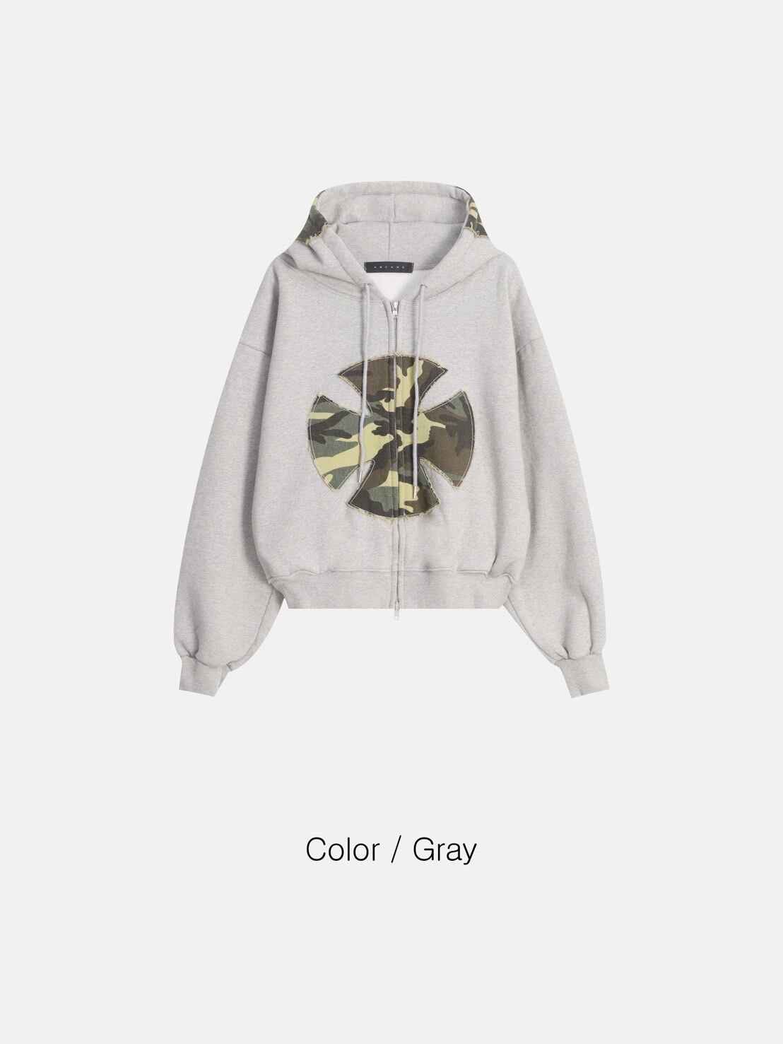 フロントに配置されたカモフラージュ柄ワッペンが印象的な、存在感抜群のジップアップパーカー。