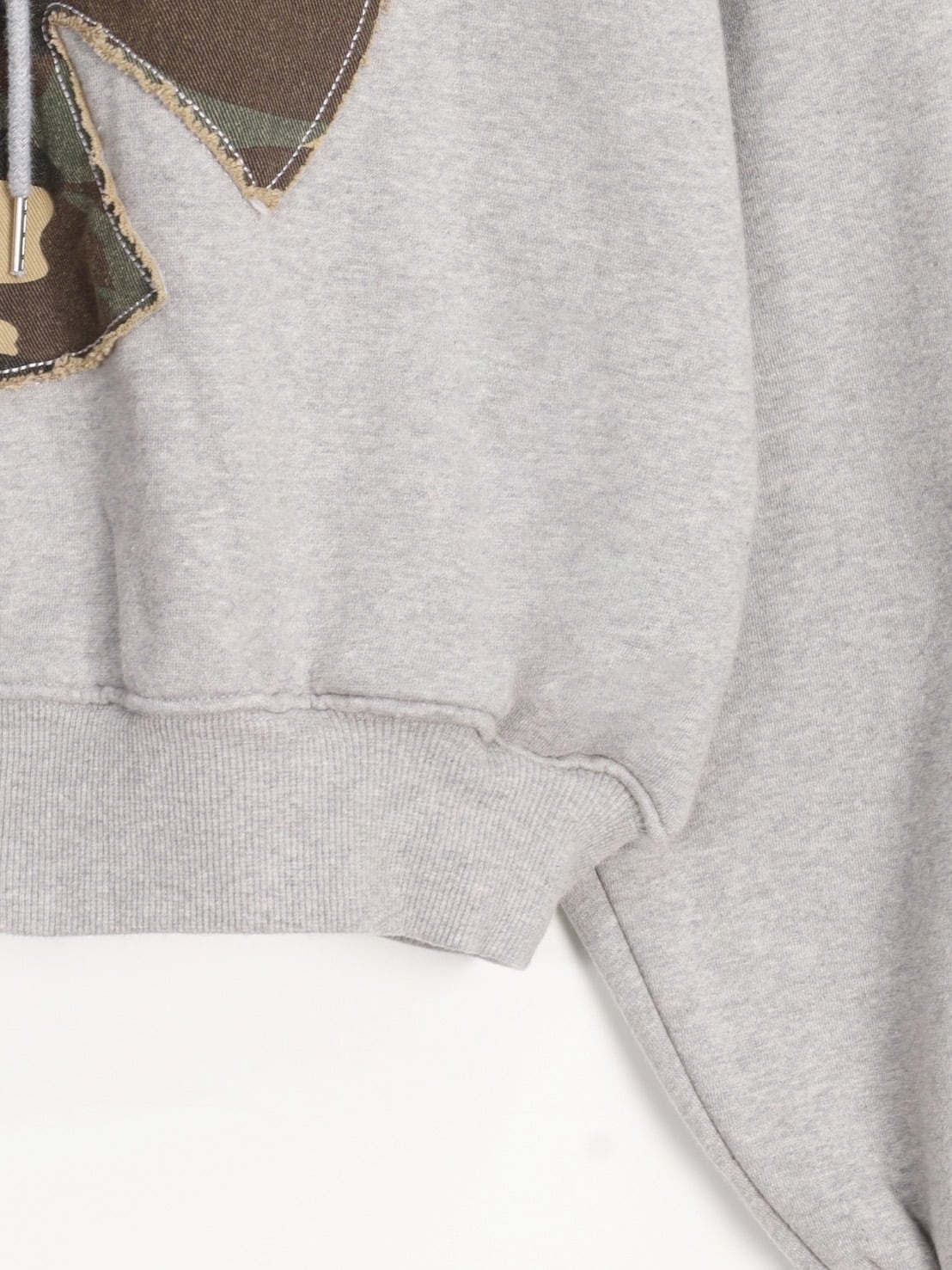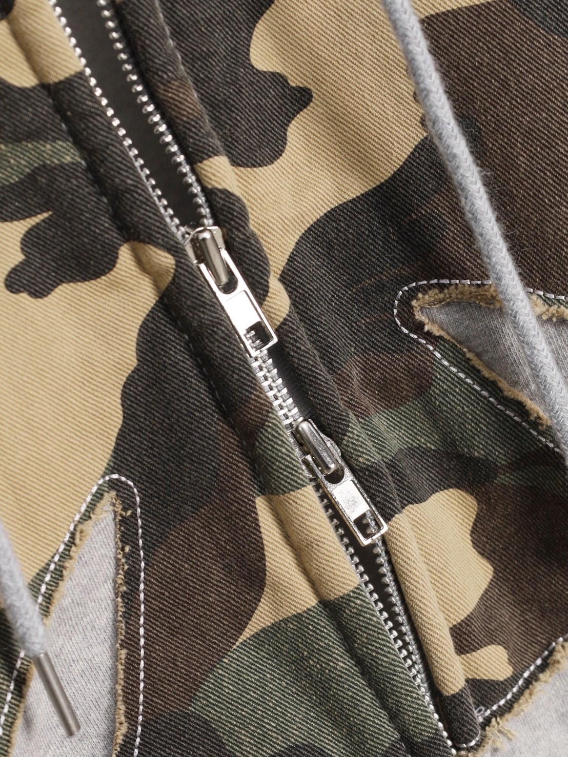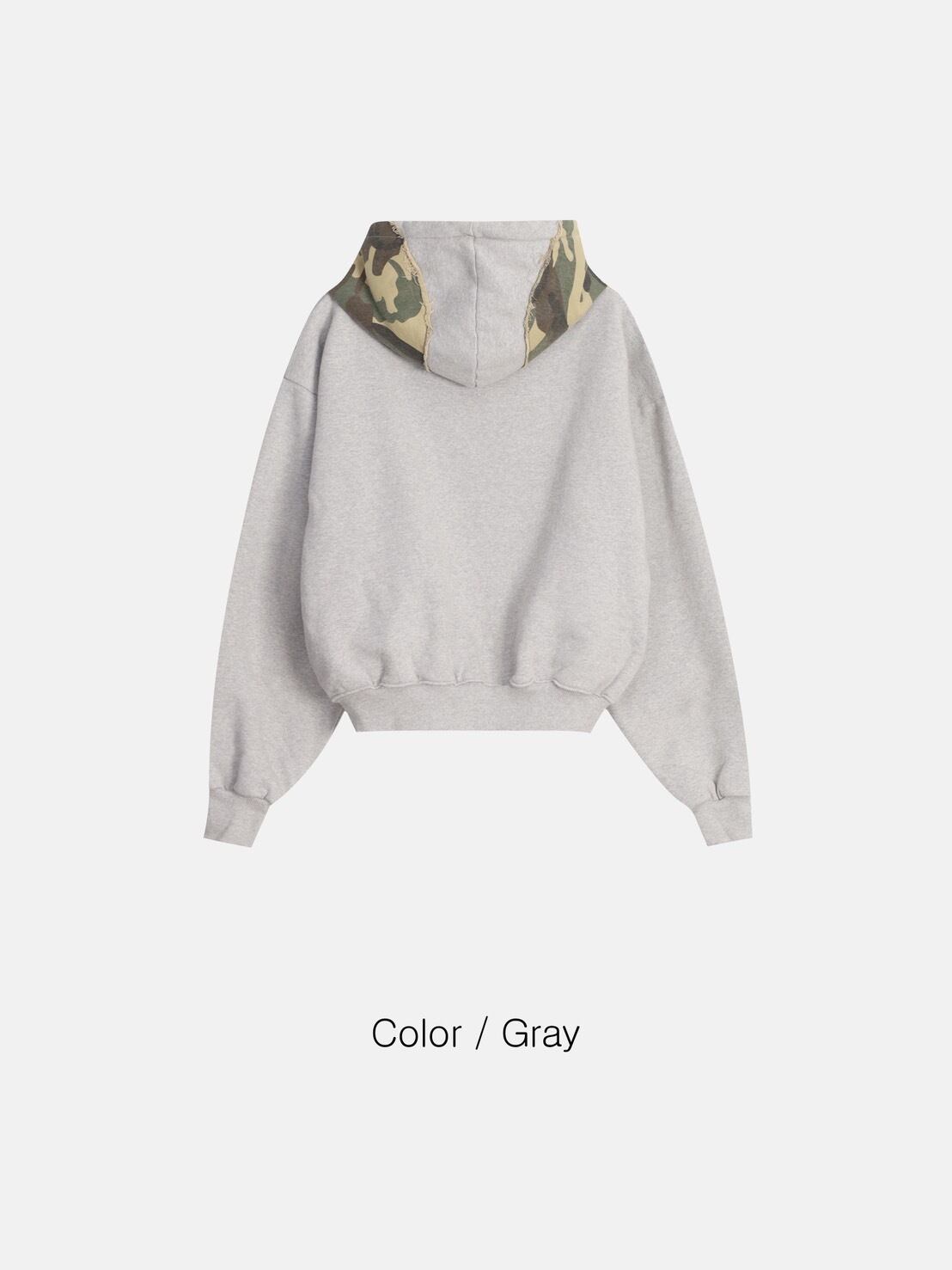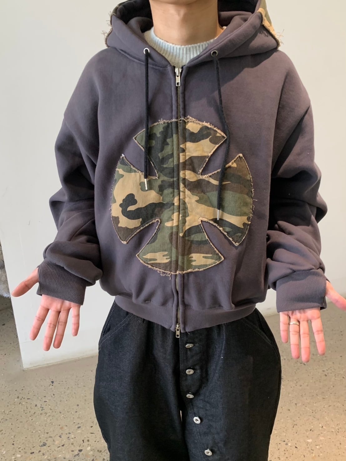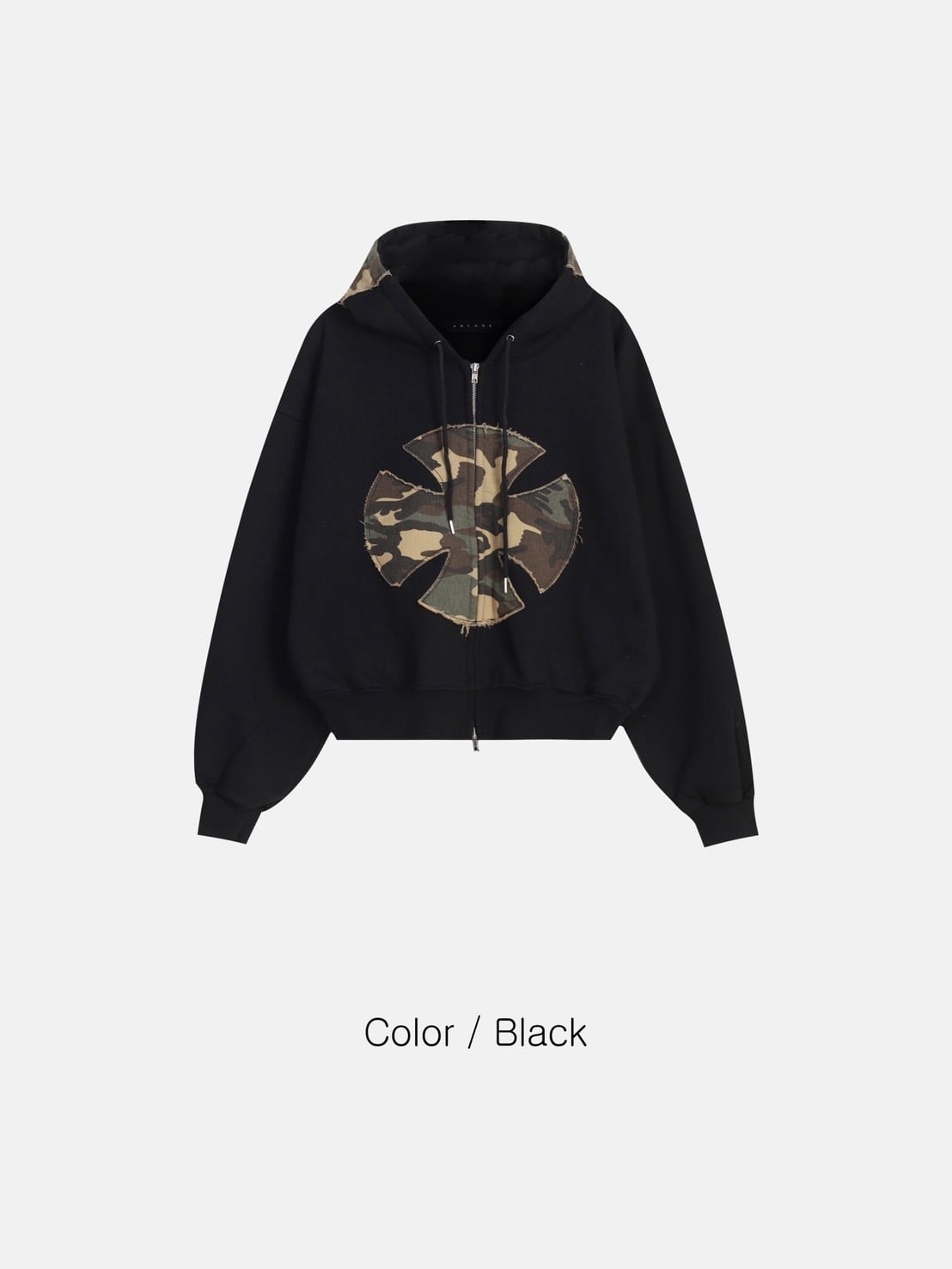 フロントに配置されたカモフラージュ柄ワッペンが印象的な、存在感抜群のジップアップパーカー。