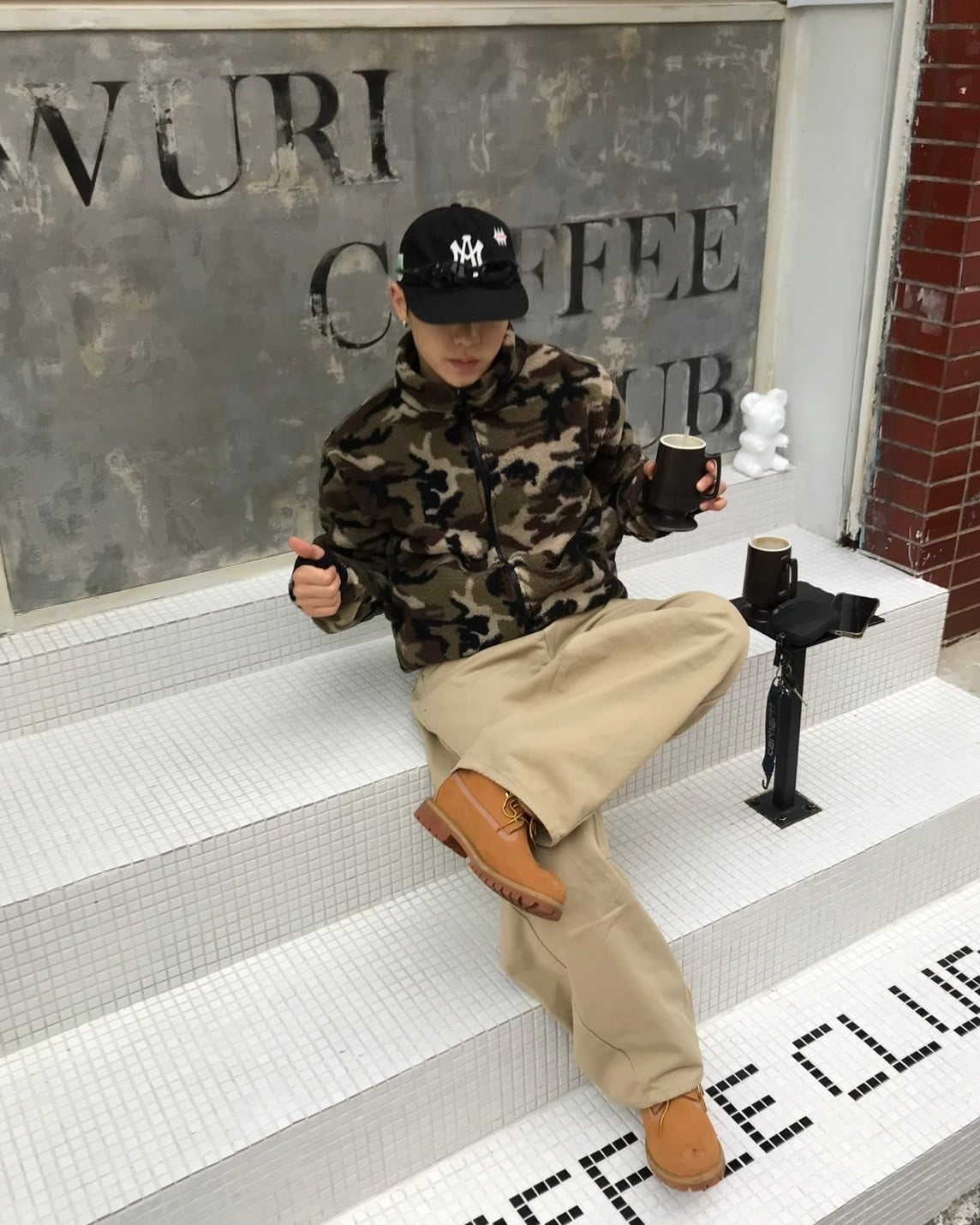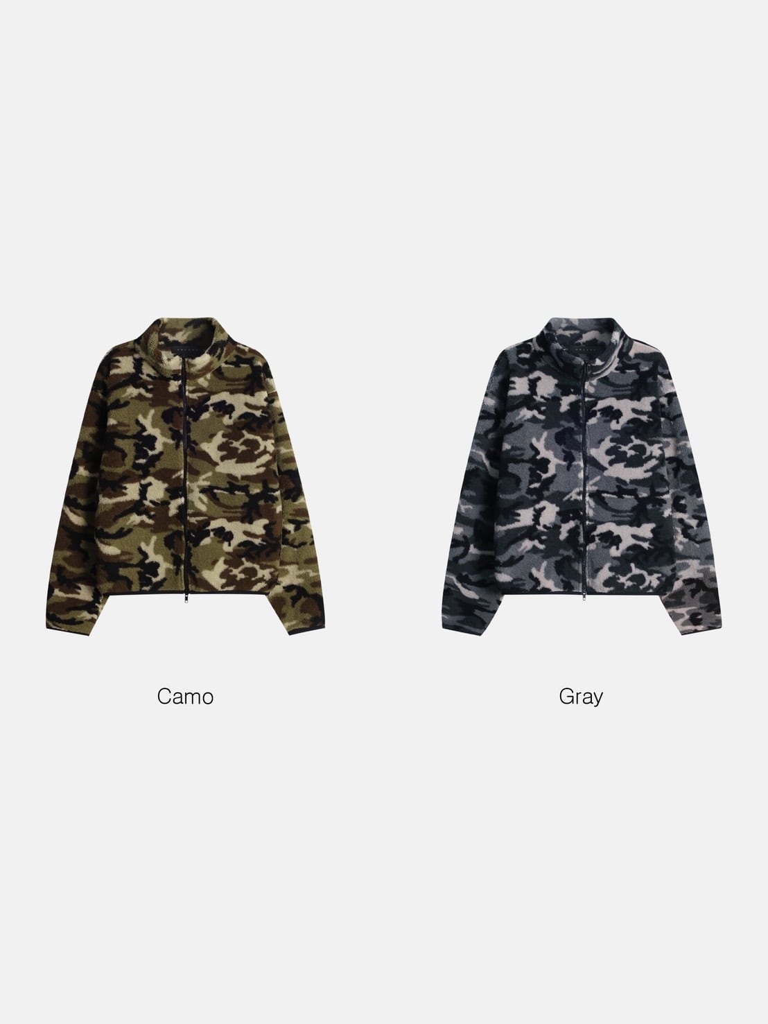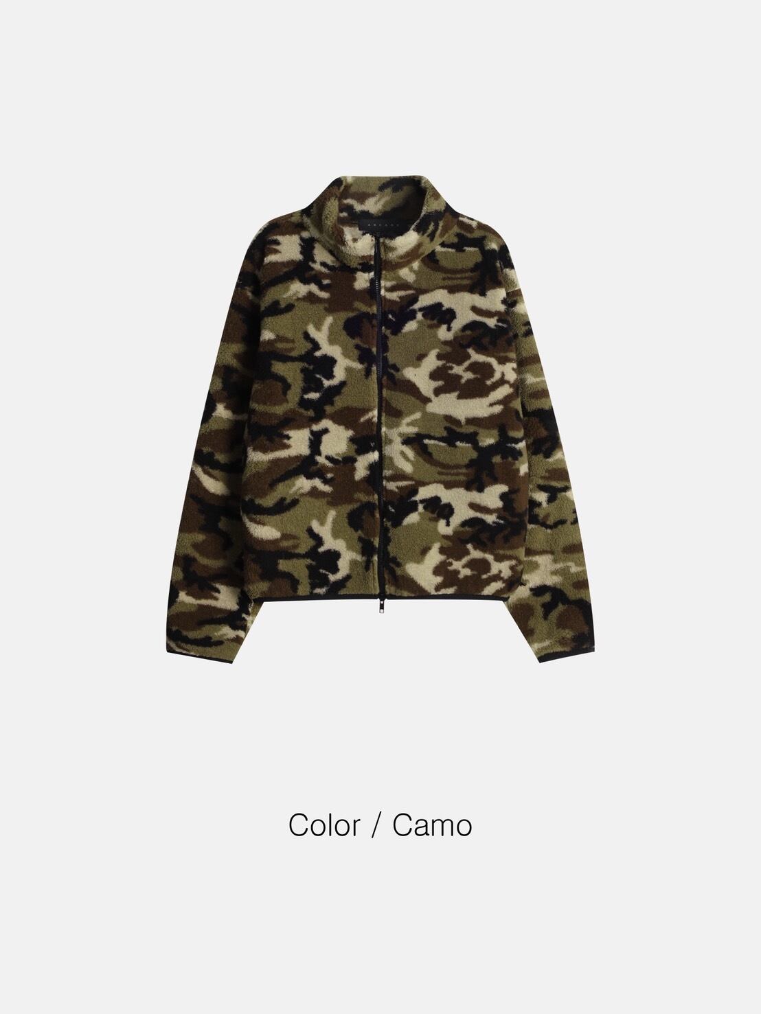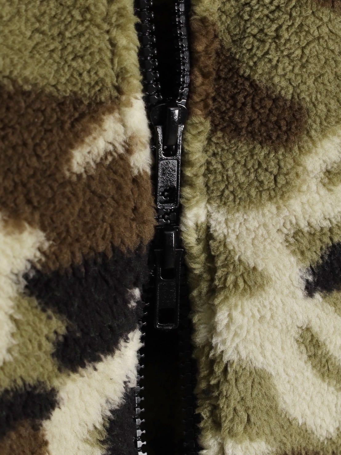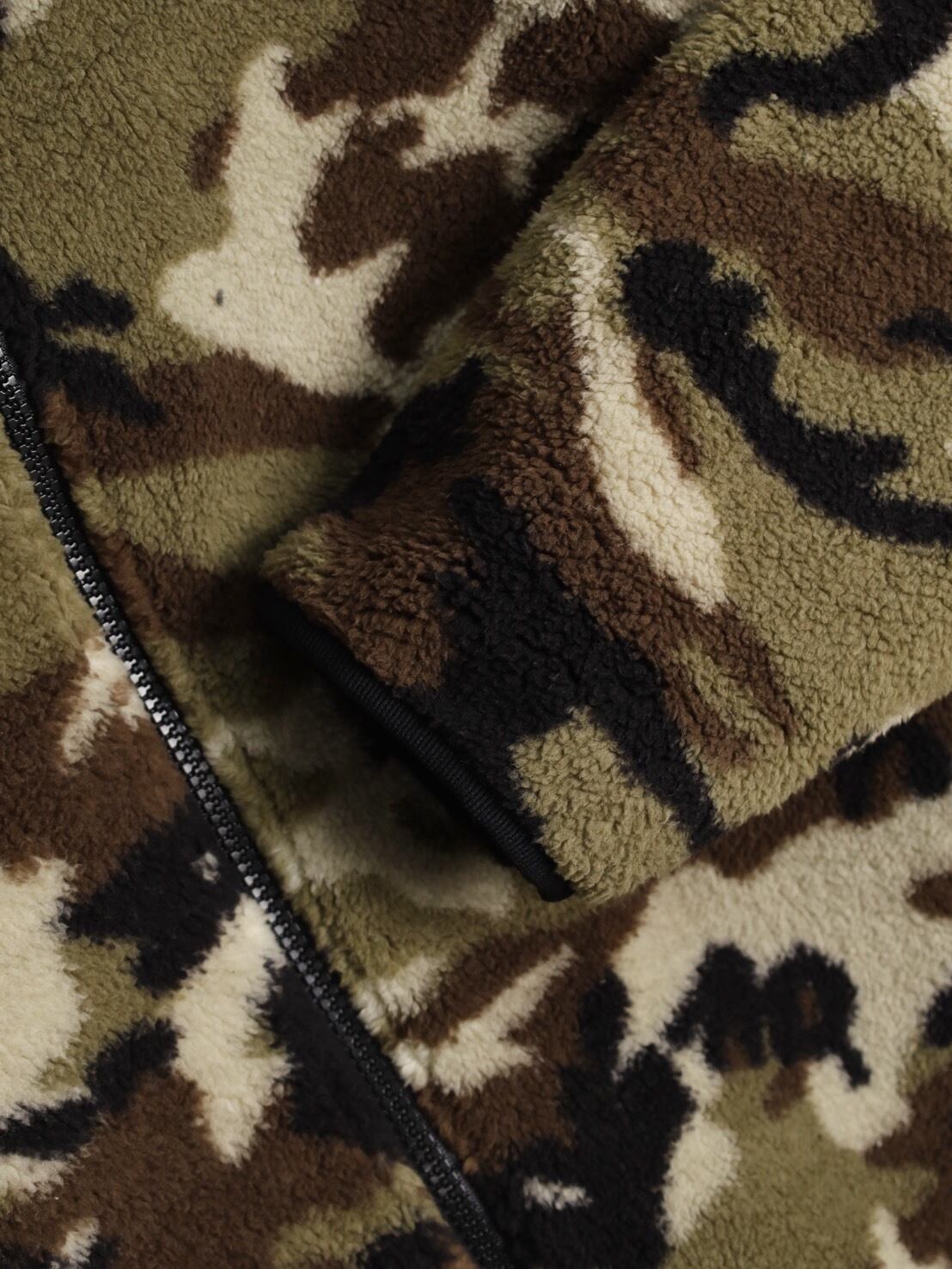 存在感のあるカモフラージュ柄が印象的な、ジップアップフリースジャケット。
