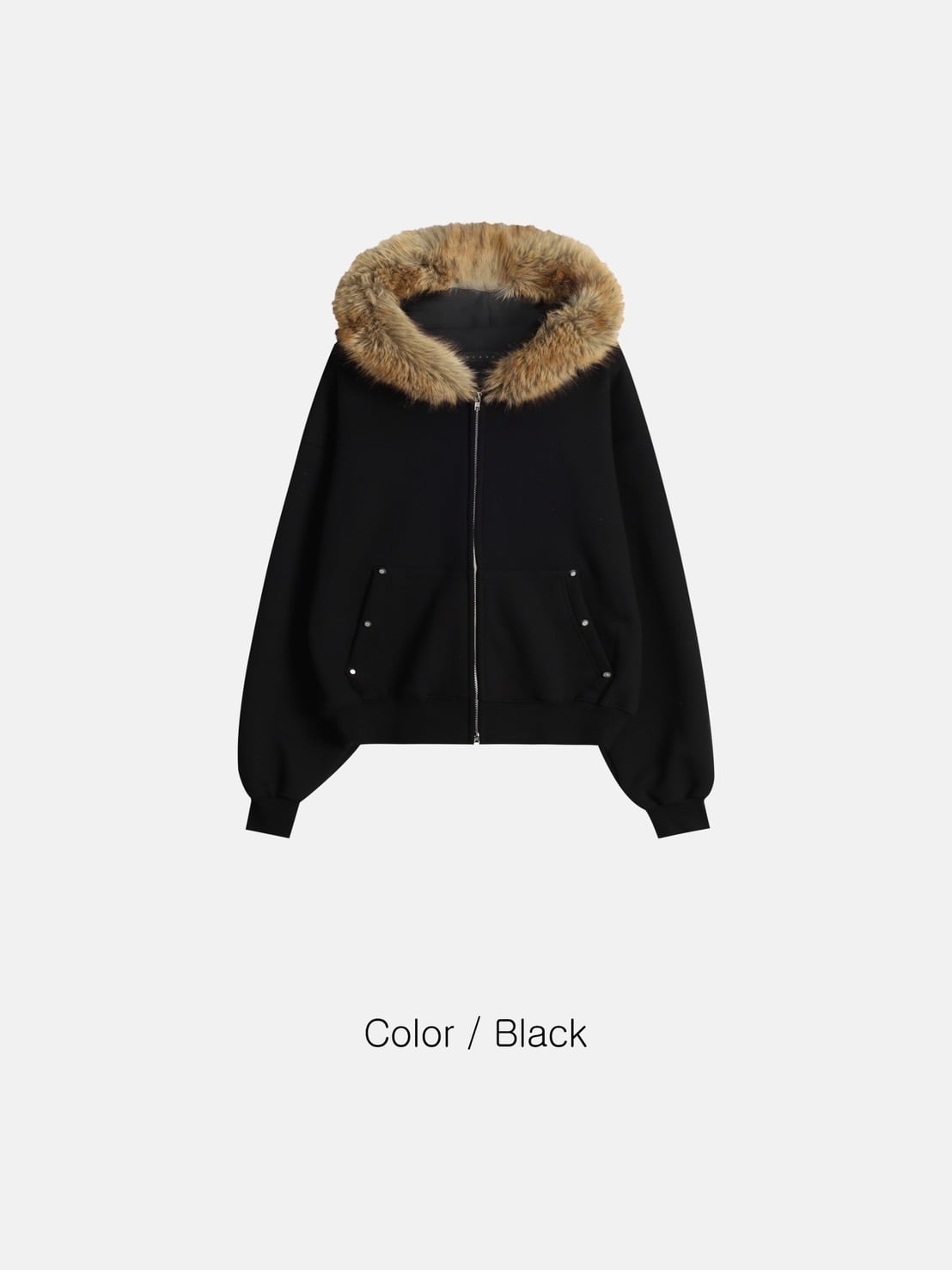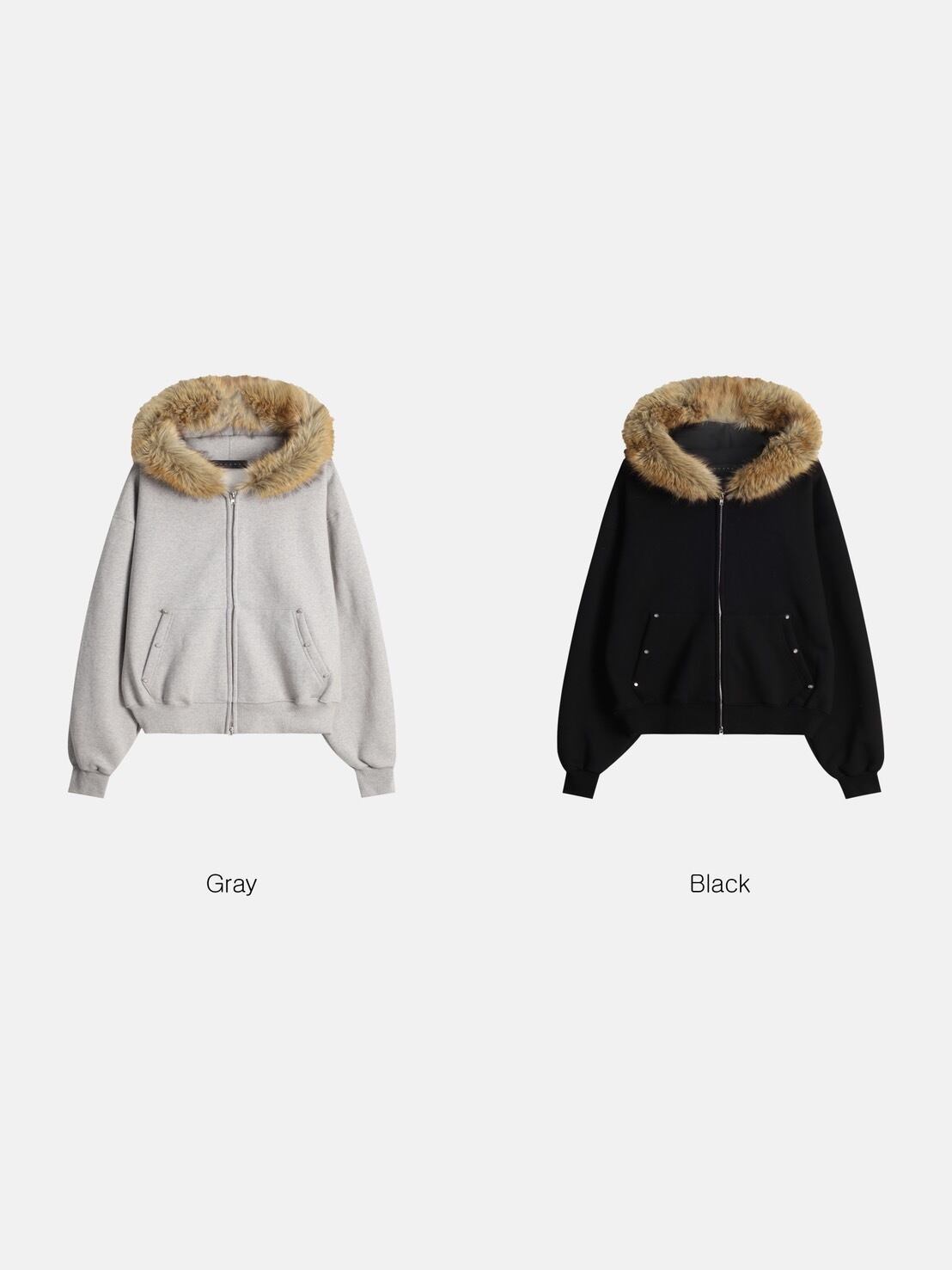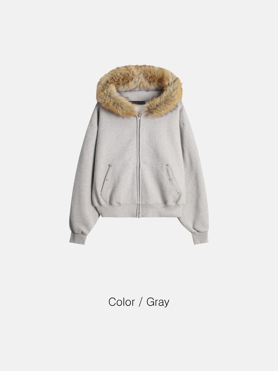 存在感のあるファーフードが印象的なジップアップパーカー。