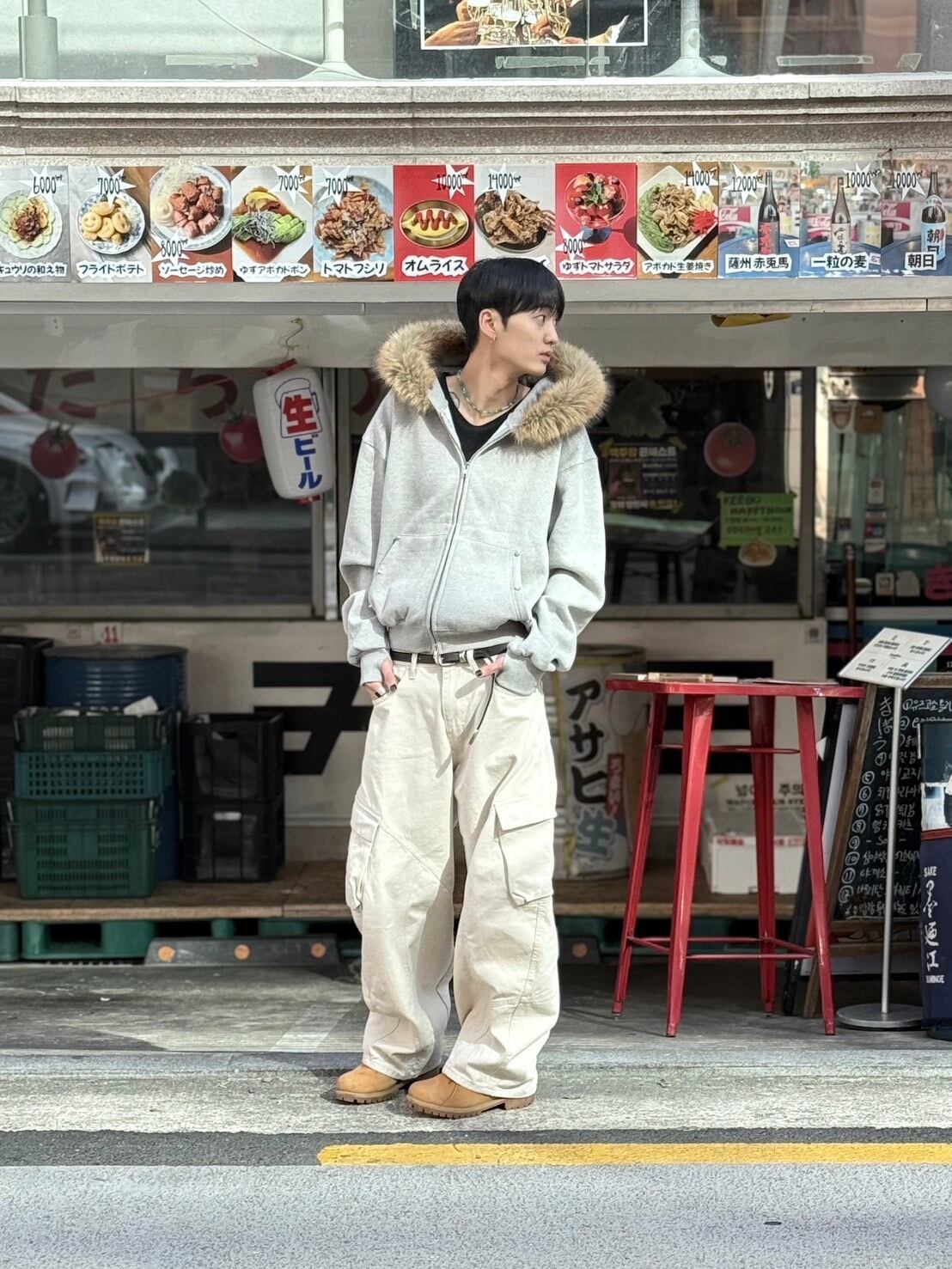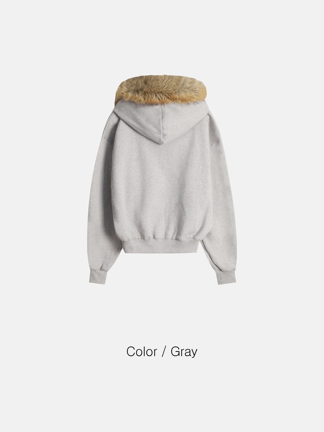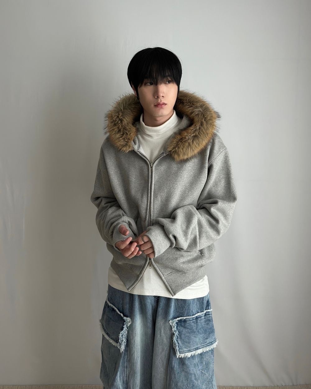 存在感のあるファーフードが印象的なジップアップパーカー。