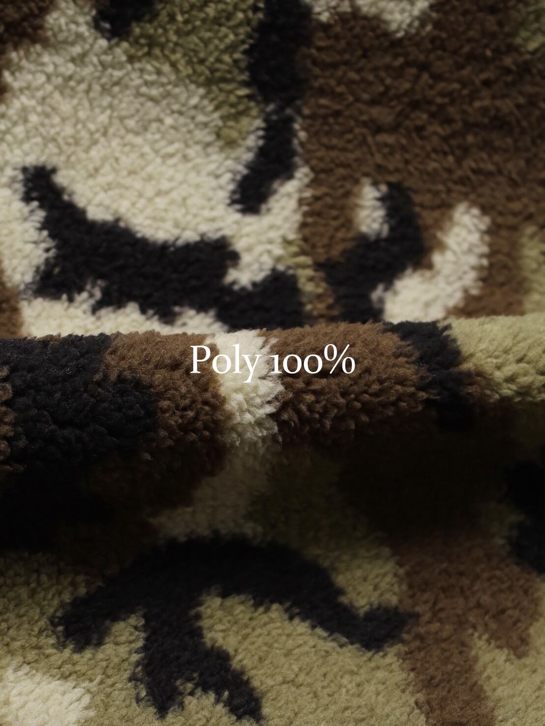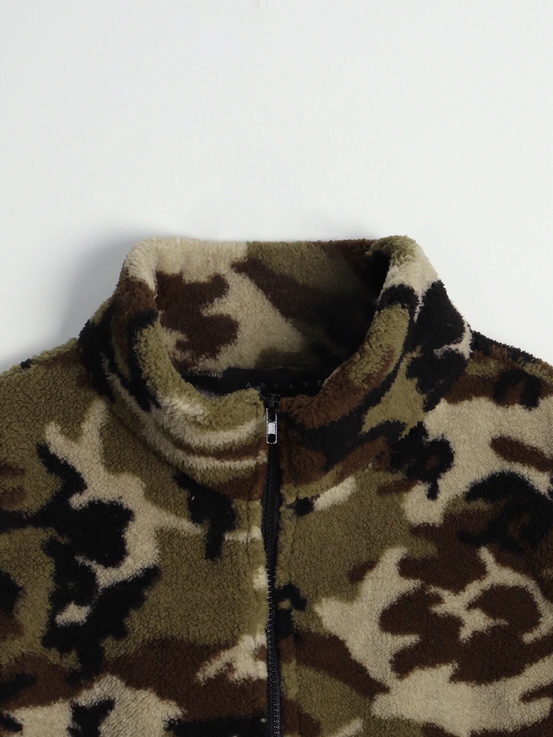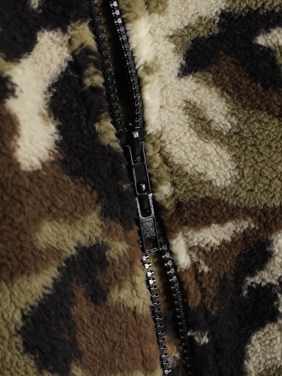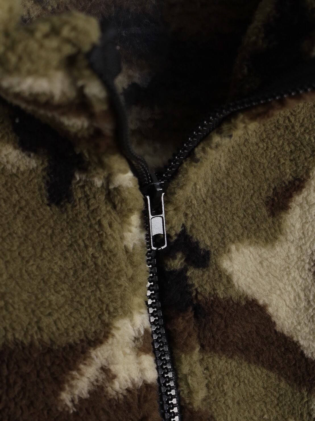 存在感のあるカモフラージュ柄が印象的な、ジップアップフリースジャケット。