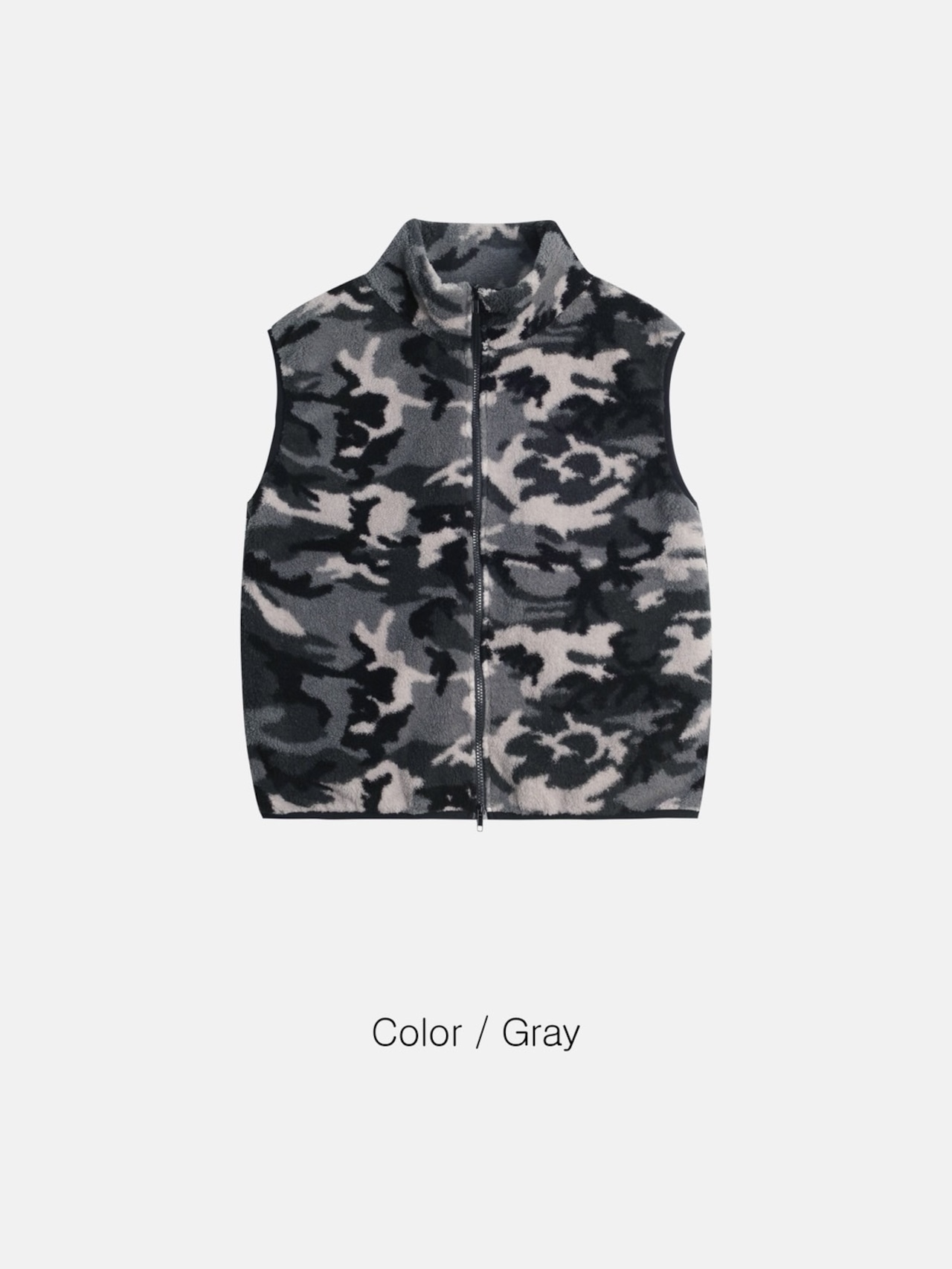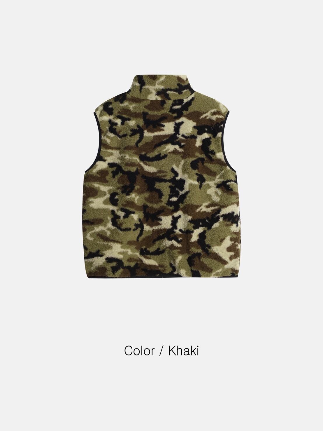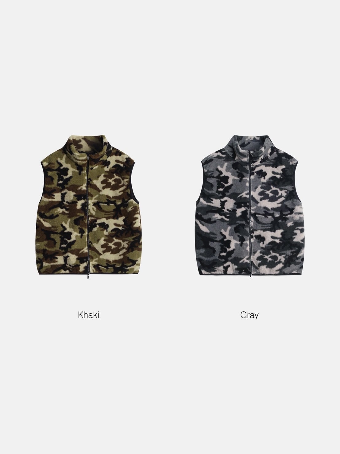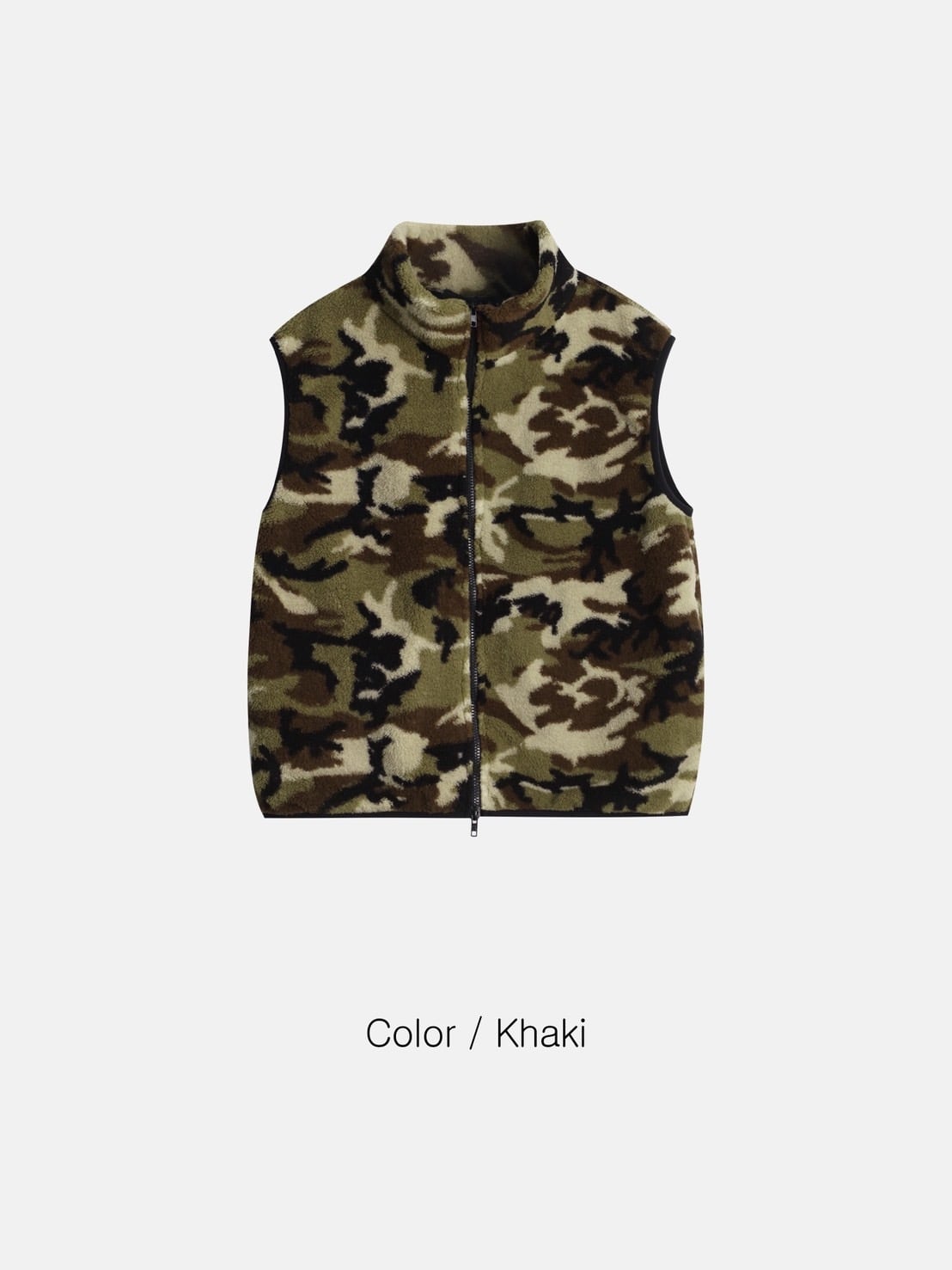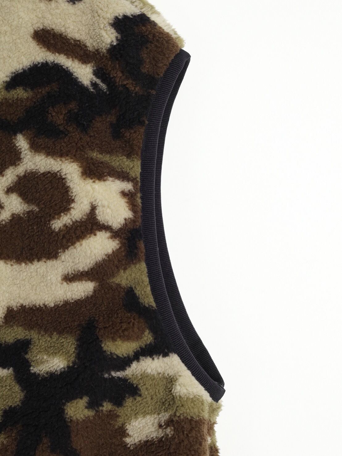存在感のあるカモフラージュ柄が印象的な、ジップアップフリースジャケット。