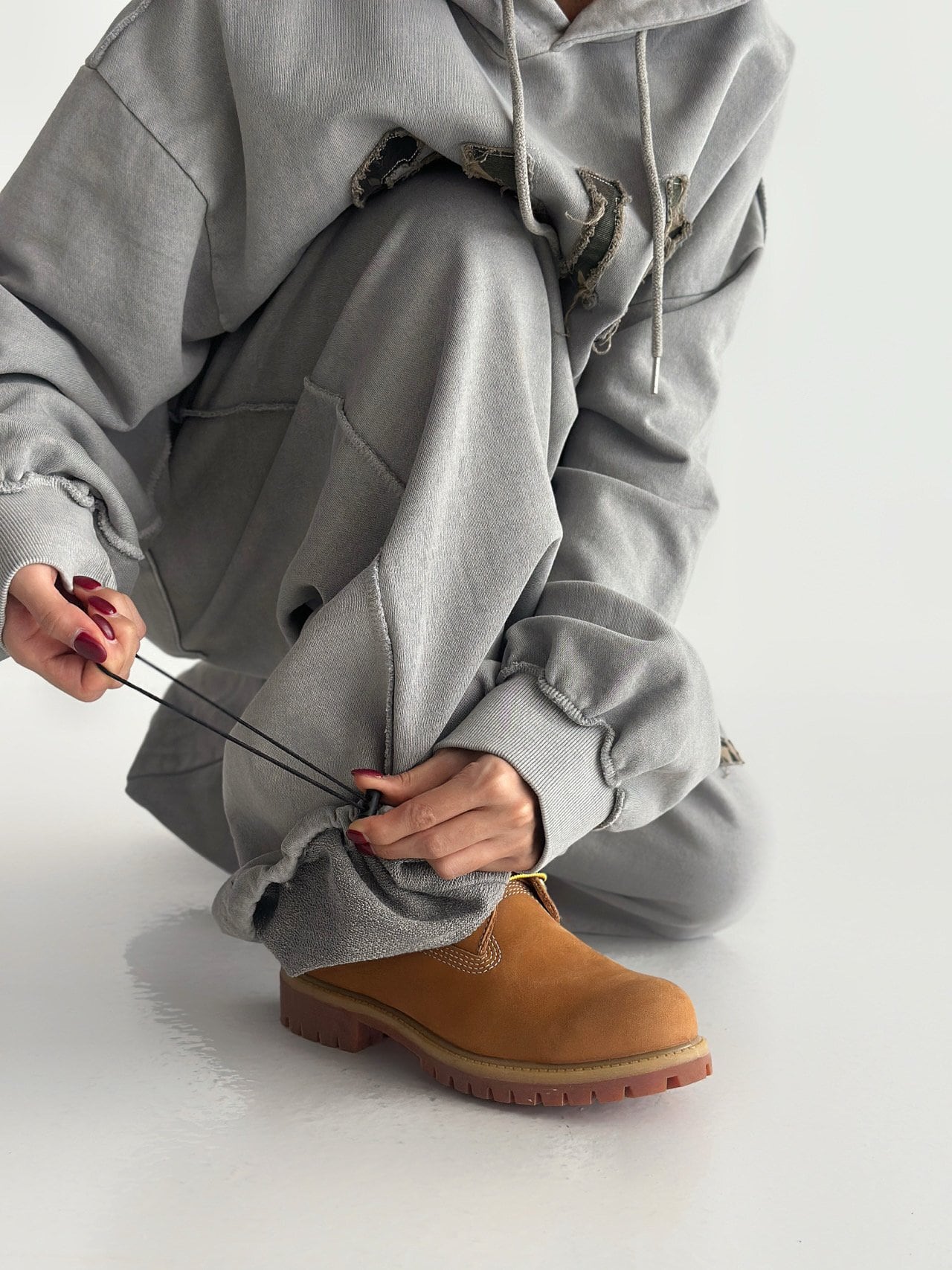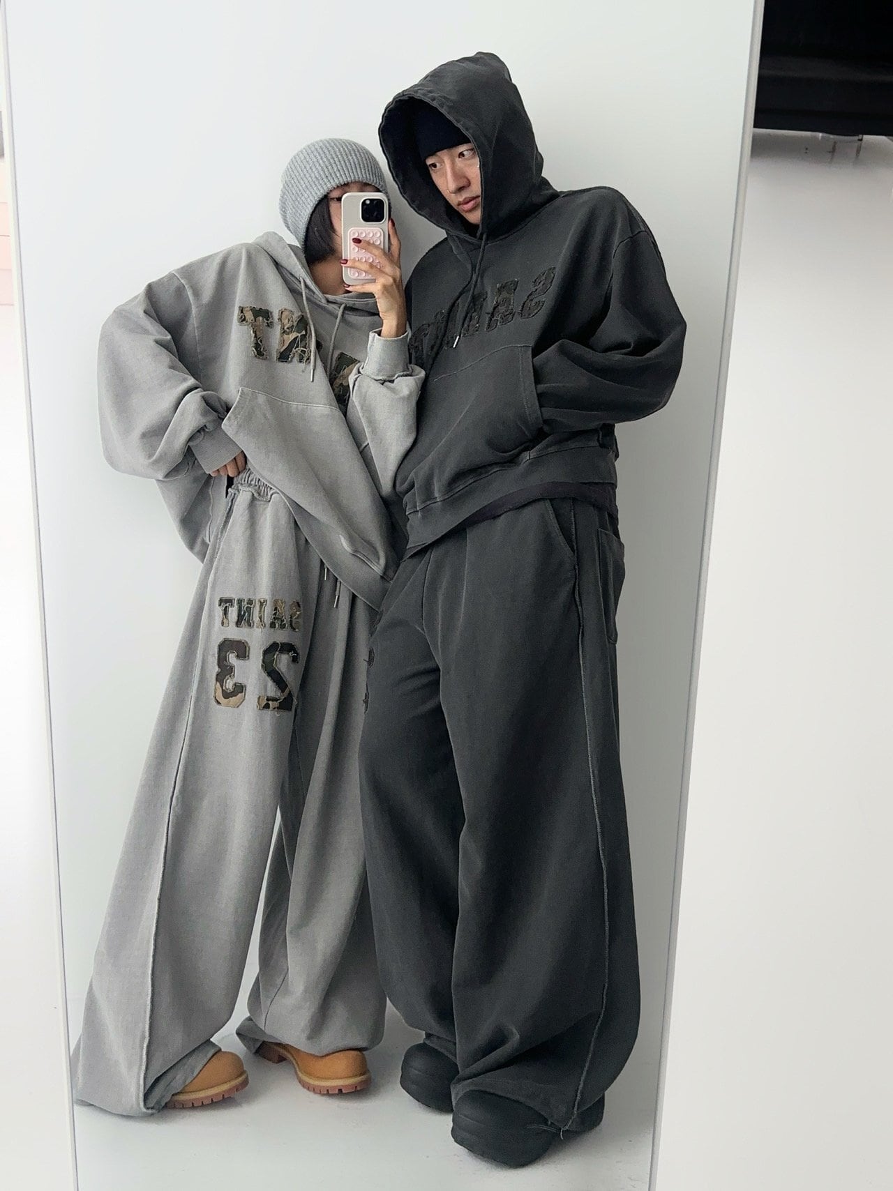 ヴィンテージ感漂うウォッシュ加工と、立体感のあるダメージロゴが特徴のセットアップ。