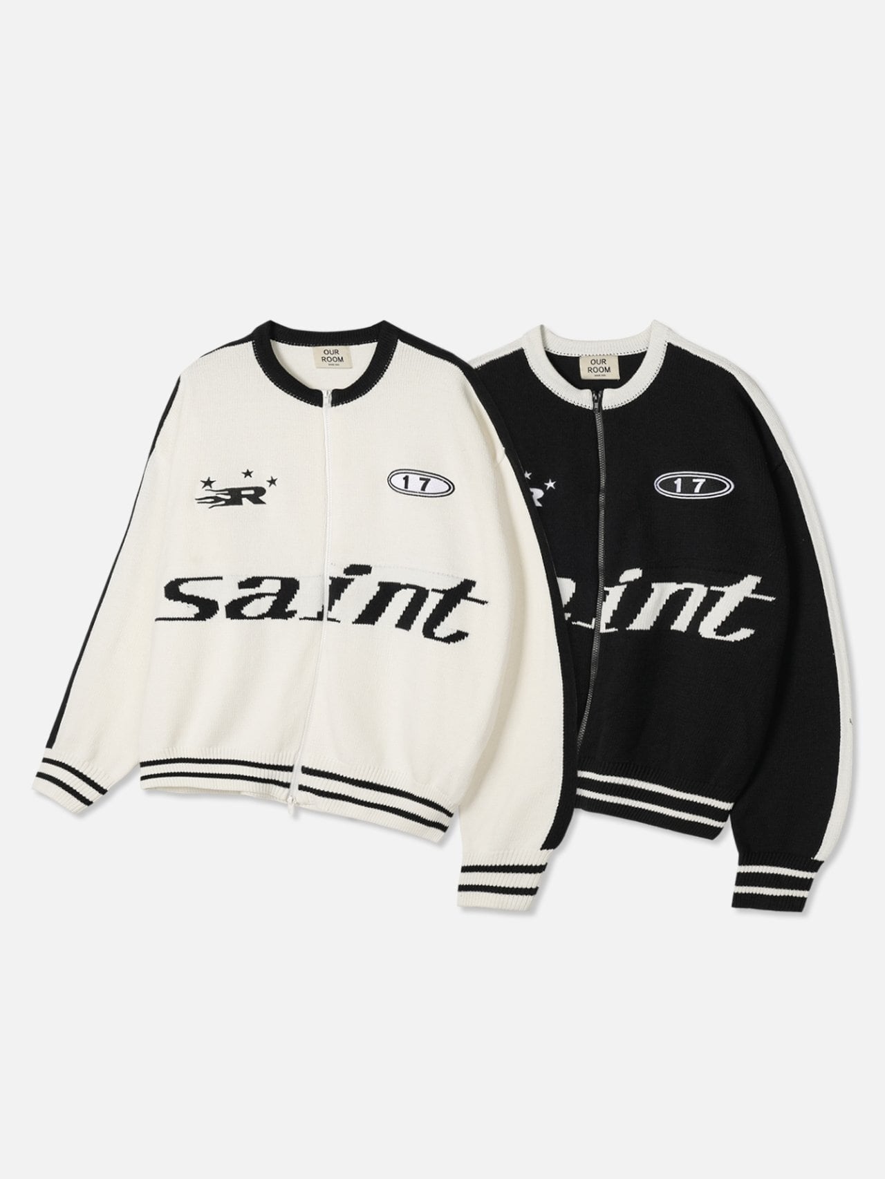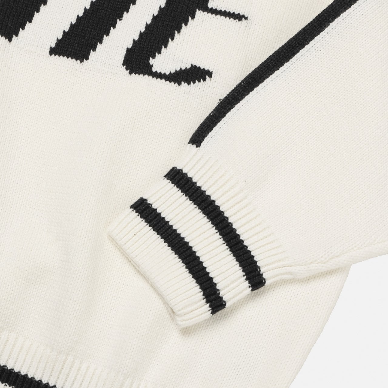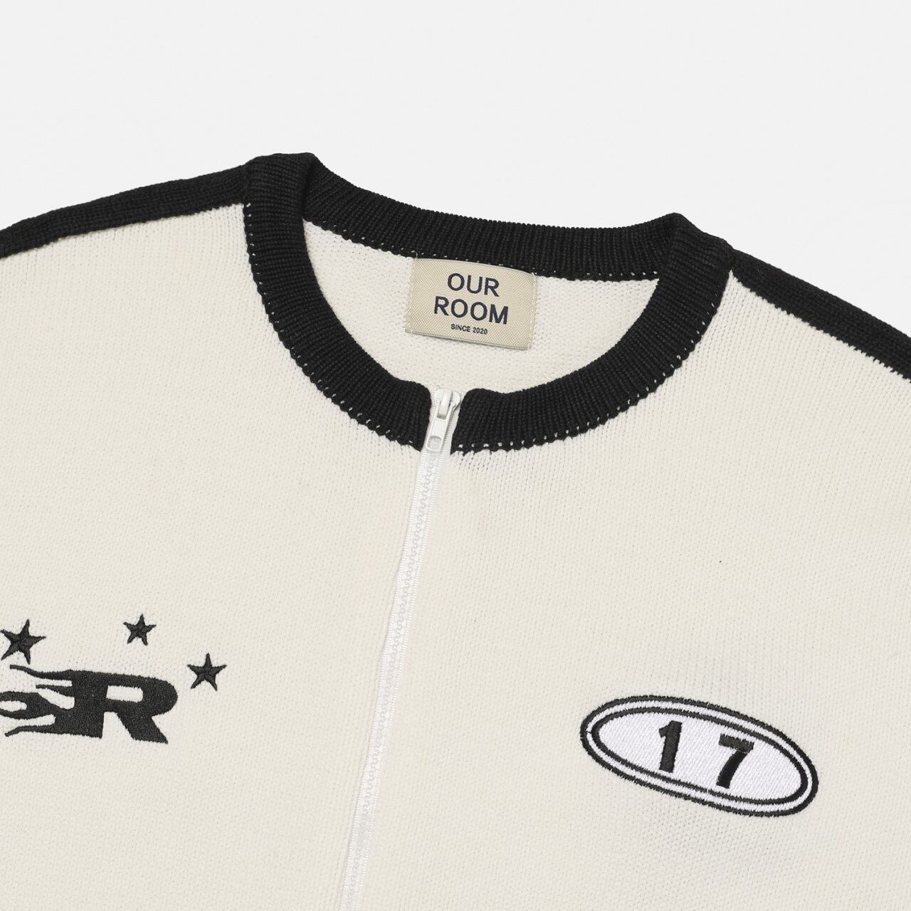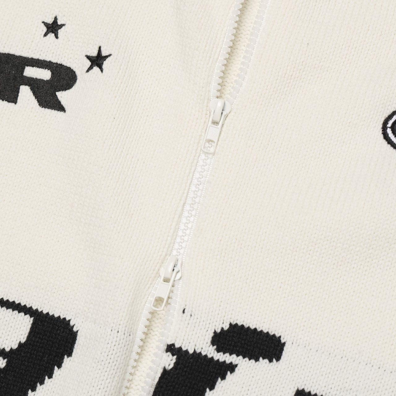 大胆なロゴデザインとスポーティーなラインディテールが特徴のジップニットカーディガン。