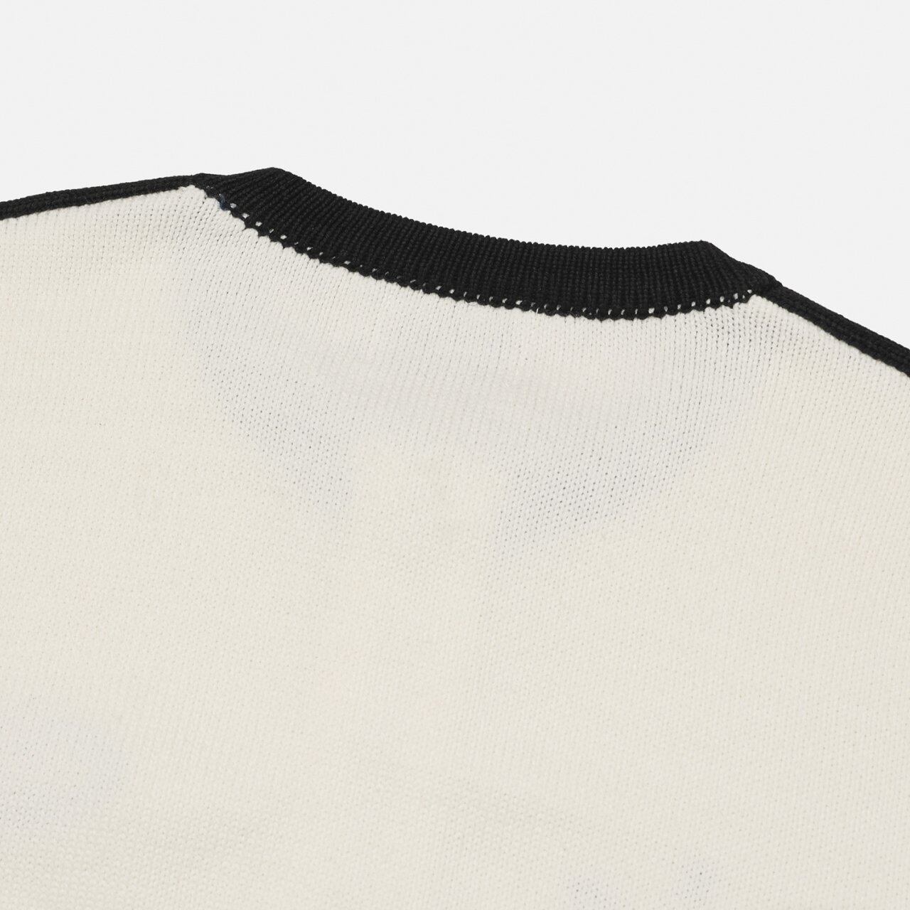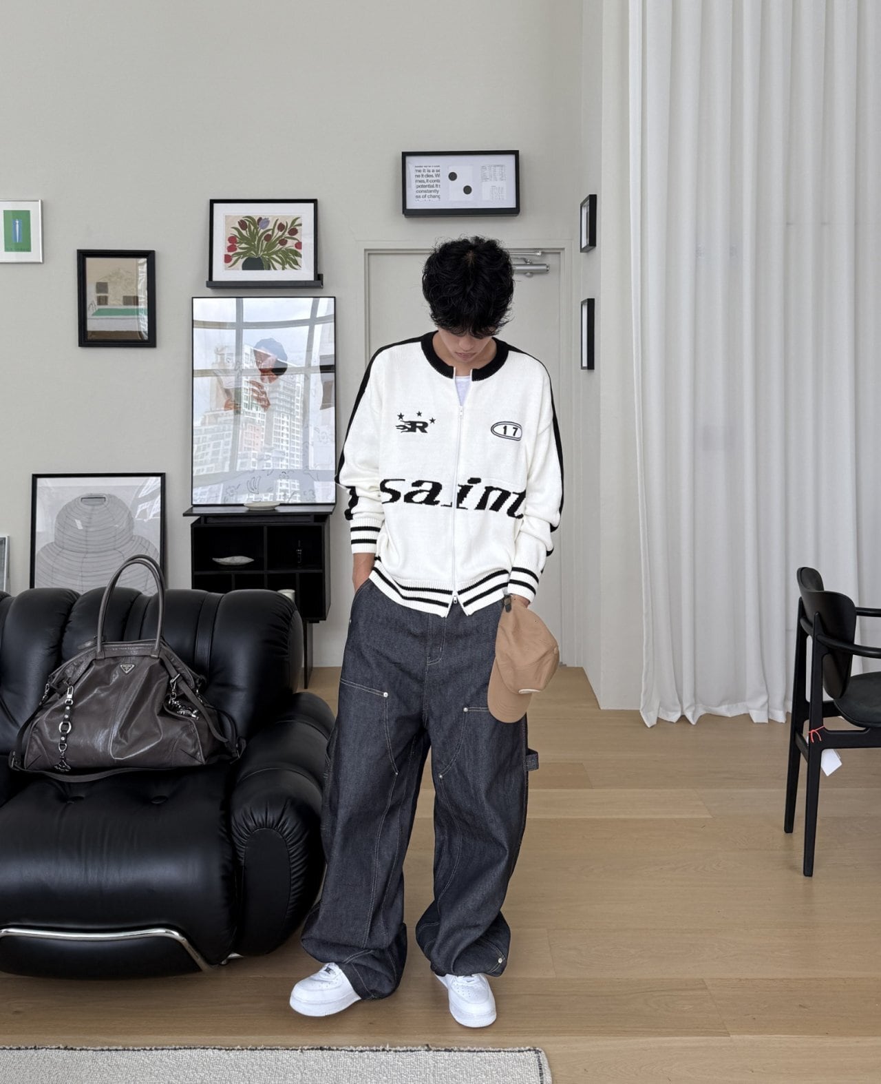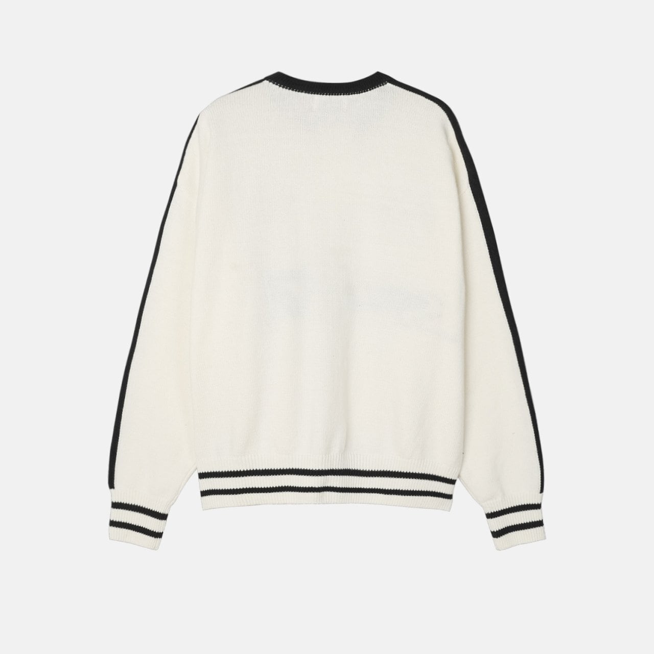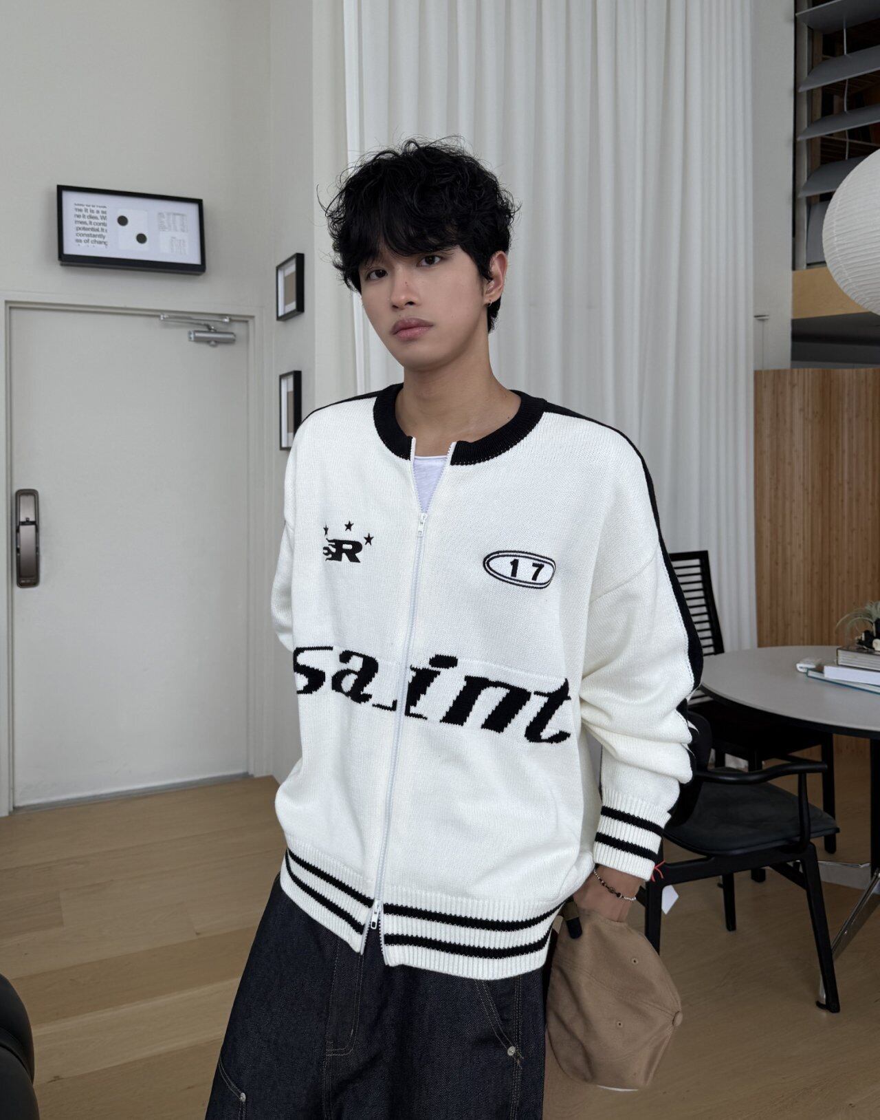 大胆なロゴデザインとスポーティーなラインディテールが特徴のジップニットカーディガン。